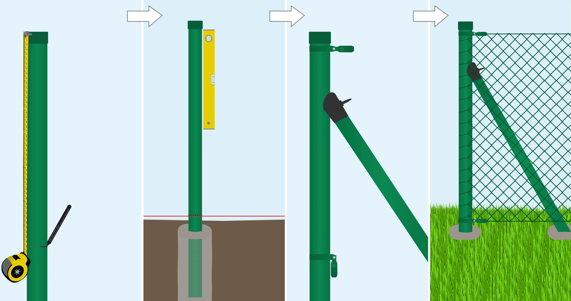 Díra by měla být hluboká alespoň 50 cm, my však doporučujeme 70-80 cm. Sloupek se nemusí dotékat země (a ani to není žádoucí). Doporučujeme však alespoň 30 cm v betonu, ideálně 50 cm a více.